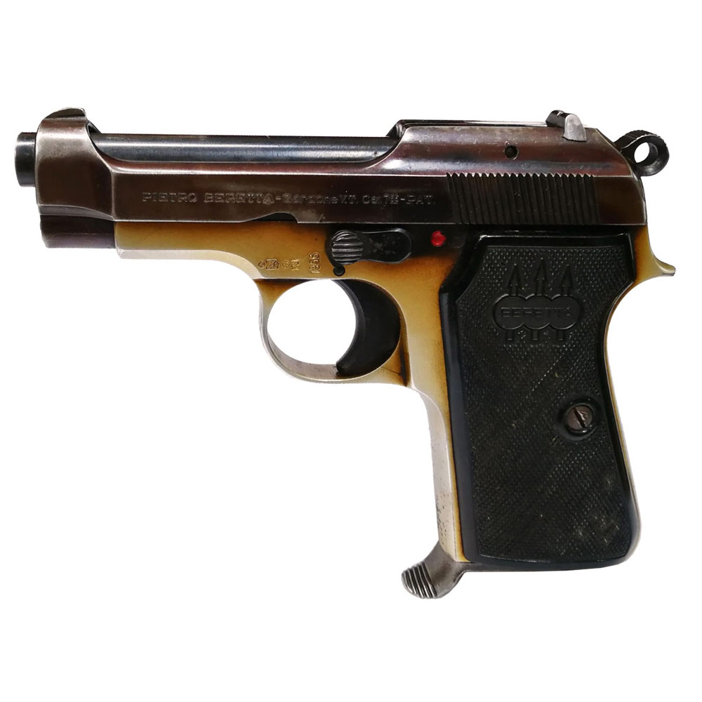 Pistola usata semiautomatica P. Beretta modello 35 con fusto in ergal, calibro 7,65. Produzione postbellica in rara variante con fusto anodizzato oro. Condizioni: discrete.