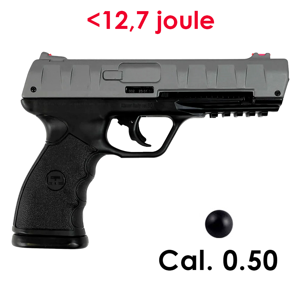 Pistola marcatore paintball calibro .50 di libera vendita con funzionamento a CO2 marca Chiappa modello Bravo 5.28 . Dotato di sistema di caricamento rapido, basta dare un colpo sotto il fondello per forare la bomboletta di co2.