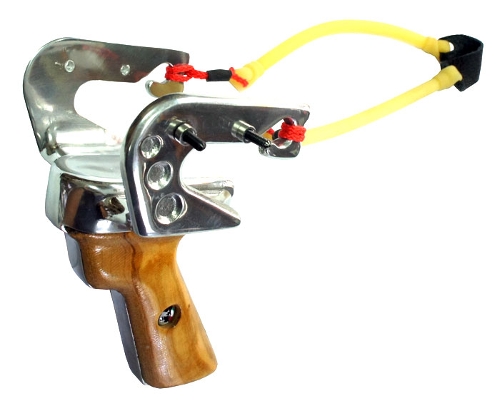 Fionda professionale LuMBro David Pro Legno con corpo in alluminio, guancette in legno e mirino. Peso 486g.