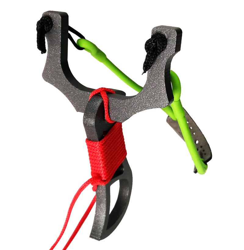 Fionda professionale LuMBro Lugar Black Night con corpo in alluminio verniciato a polvere grigio scuro e impugnatura in corda di colore rosso. Peso 355.
