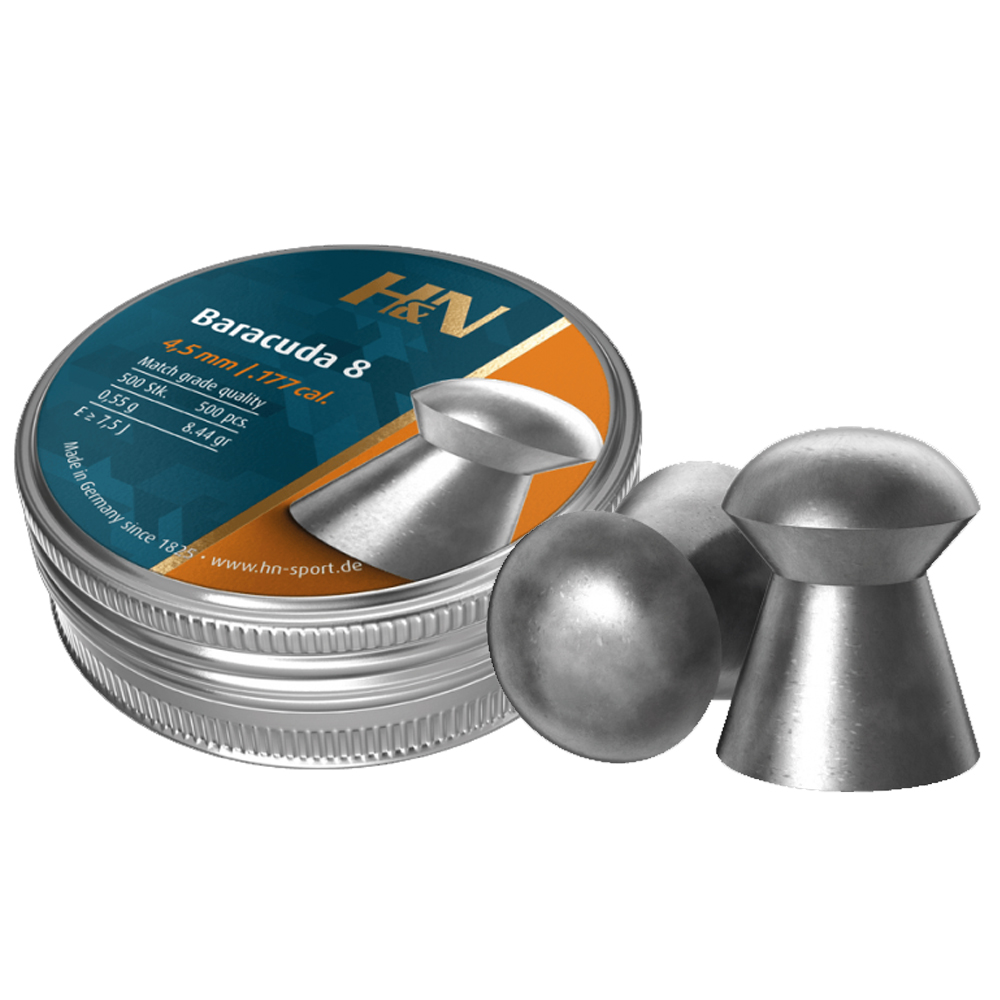 Diaboli Haendler & Natermann Baracuda 8 calibro 4,51 lisci, con testa arrotondata. Pellet accuratamente selezionati, di peso medio per distanzefino a 50 metri, dalle ottime propriete aereodinamiche. Peso: 0,55 g. (8,44 Ggr.) Forniti in confezioni da 500 pezzi. 750447 P. 280g