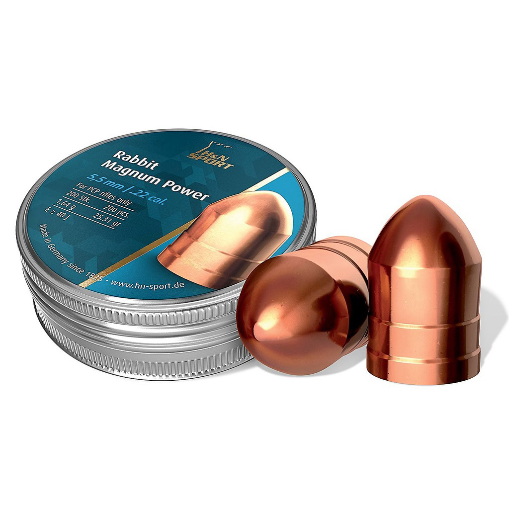 Diabolo Haendler & Natermann modello Rabbit Magnum Power calibro 5,5 mm (.22), consigliato per carabine a PCP. Pellet di peso molto elevato per lunghe distanze, dalla massima forza d'impatto e massima penetrazione. Speciale rivestitura in rame (20% più resistente di rivestiture in piombo). Peso: 1,67 g. Forniti in confezioni da 200 pezzi. 9226550003. 750288