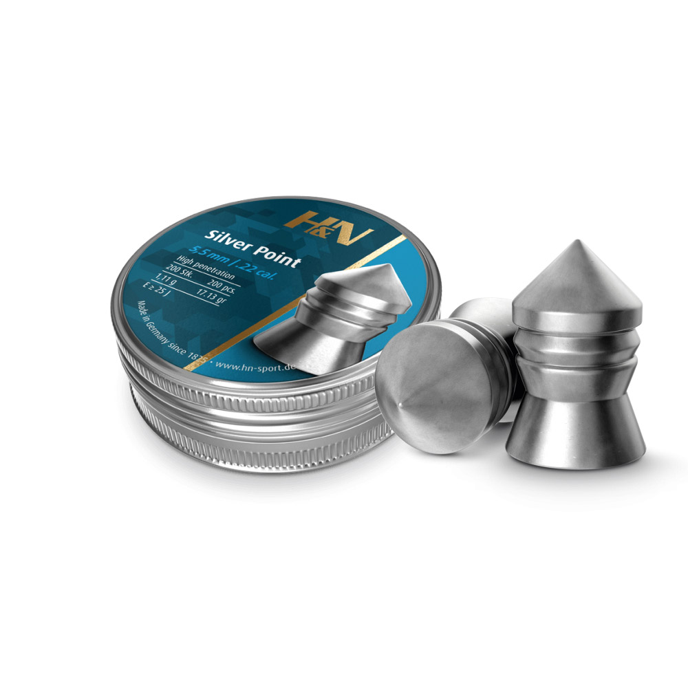 Diabolo Haendler & Natermann modello Silver Point calibro 5,5 mm. (.22) con punta e doppia rigatura orizzontale. Pellet di peso elevato per medie distanze. Peso: 1,11 g. Forniti in confezioni da 200 pezzi. 92345500003