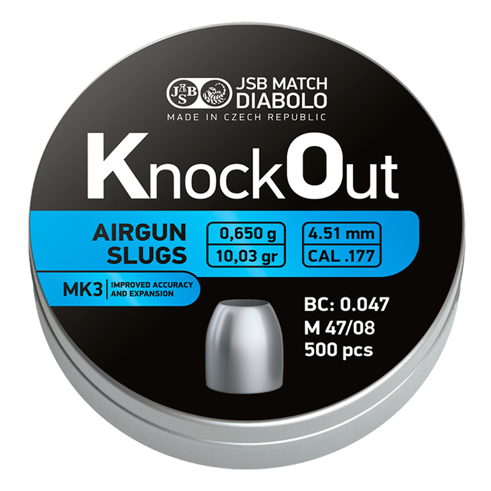 Diabolo Josef Schulz Bohumin calibro 4,51 mm modello KnockOut MKIII, in piombo liscio, slug/hollow point . Peso: 0,65 g. Altezza 5,20 mm. Forniti in confezione da 500 pezzi. (546 546324-500)