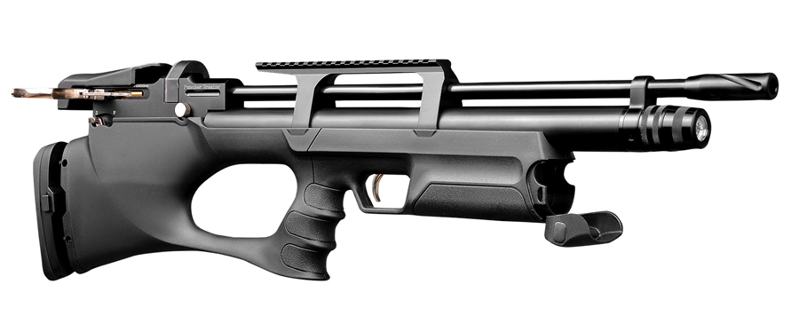 Carabina calibro 4,5 di LIBERA VENDITA con funzionamento PCP marca Kral modello Puncher Breaker con calcio in polimeri. Fornita con 2 caricatori da 14 colpi, base monocolpo e moderatore di suono. Lunghezza totale 73 cm; lunghezza canna 53cm; Peso 3,3 kg.