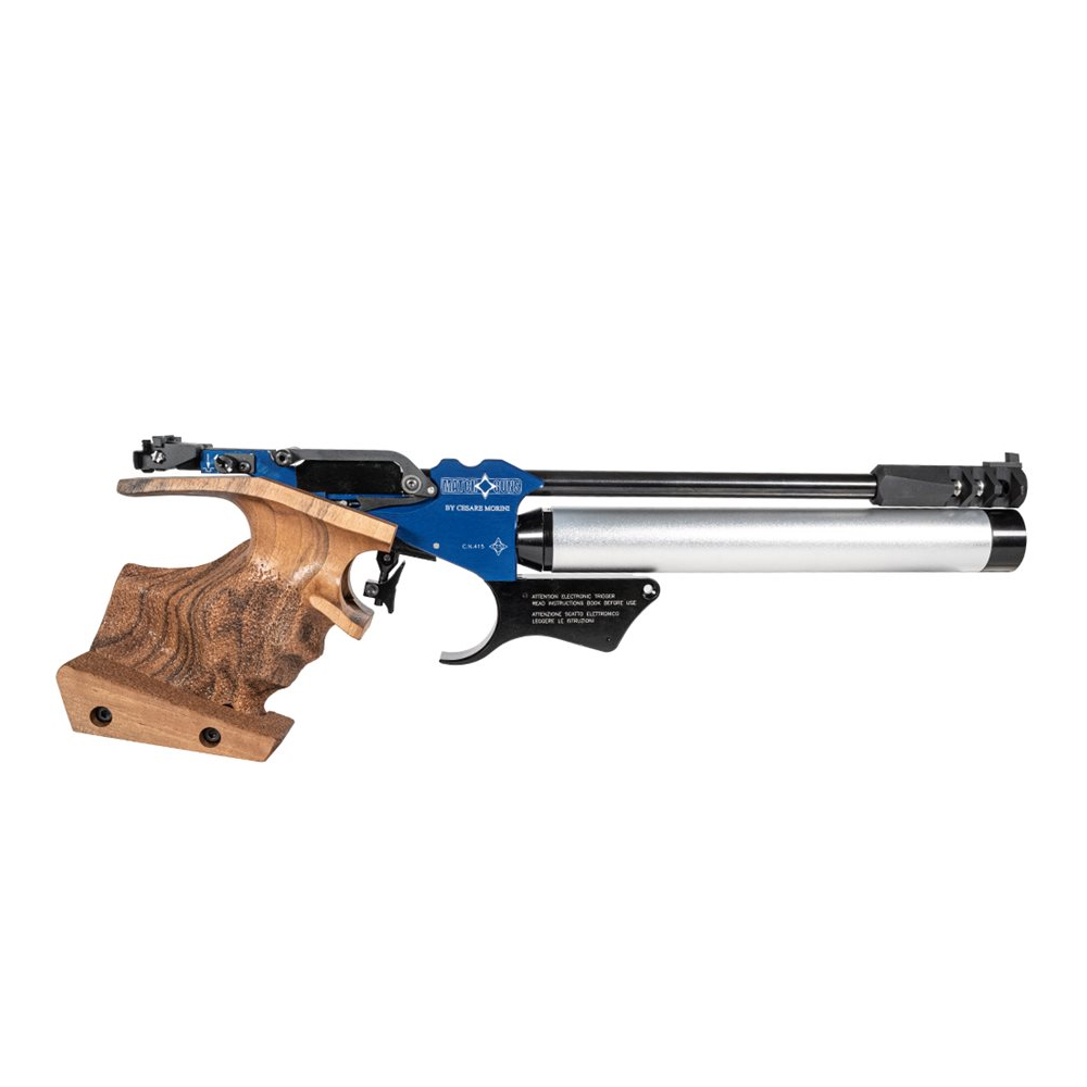 Pistola usata calibro 4,5 con funzionamento PCP marca Match Guns modello MGH1 Hybrid. Completa di tutta la dotazione di fabbrica. Scatto elettronico e meccanico selezionabile attivando l´interruttore. Arma in perfette condizioni, appena revisionata ed effuttuata sostituzione completa oring serbatoi, impugnatura "M" personalizzata con stucco.