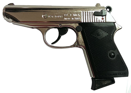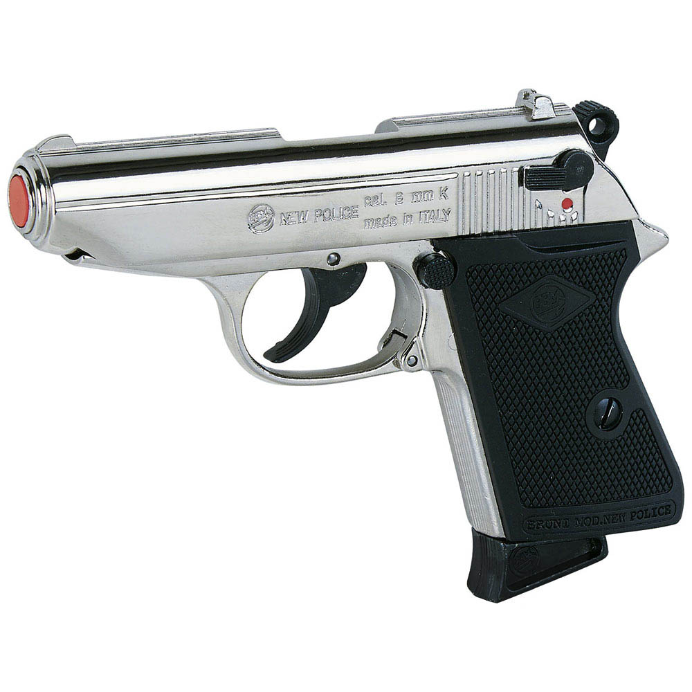 Pistola semiautomatica calibro 8 mm a salve "Bruni" modello Police, nikel matte, con funzionamento a singola azione e sicura manuale. Capacità colpi 7,lunghezza 150 mm, scatolata. Simile per dimensioni e forma alla Pistola GALESI versione inox.