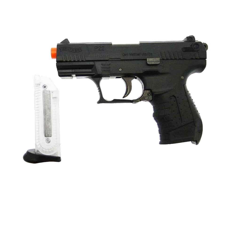 Pistola Umarex a molla calibro 6 mm modello Walther P22, realizzata in materiale plastico, con alcuni dettagli in metallo. Spara pallini da 6 mm. in plastica, ceramica e alluminio. Corredata di blister con 50 pallini in plastica e libretto istruzioni. Perfettamente identica alla Walther modello P22 (logo e marchio Walther inciso sulle guancette e carrello). UM-5179.