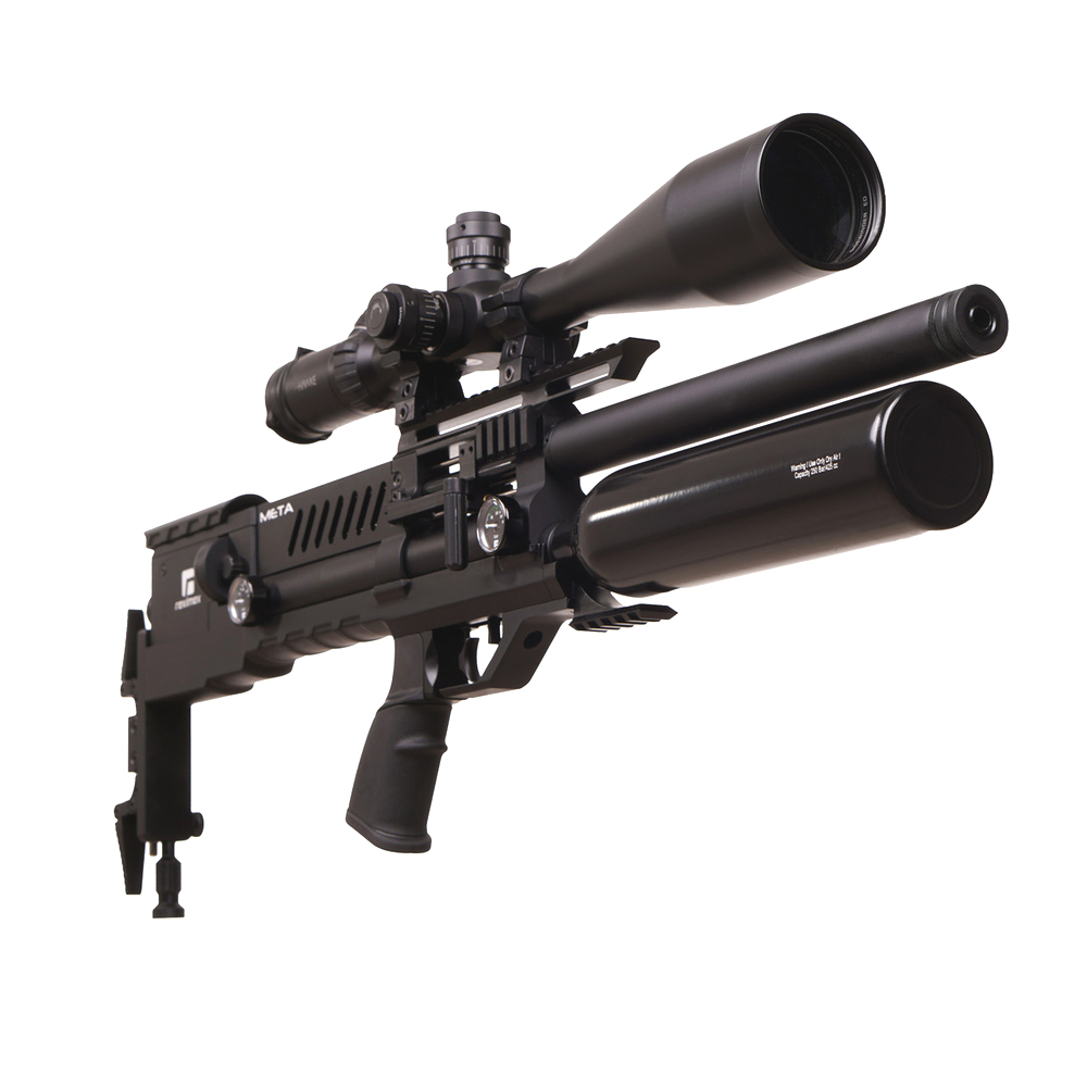 Carabina di libera vendita con funzionamento PCP marca Reximex modelloMeta Plus in calibro 5,5 con calcio in tecnopolimeri e alluminio, grilletto regolabile, slitta weaver/picatinny per il montaggio di ottiche,regolatore di pressione, regolazione esterna della massa battente, dotato di precamera, volata filettata 1/2" UNF, calciolo regolabile. Ottica non inclusa nel prezzo.