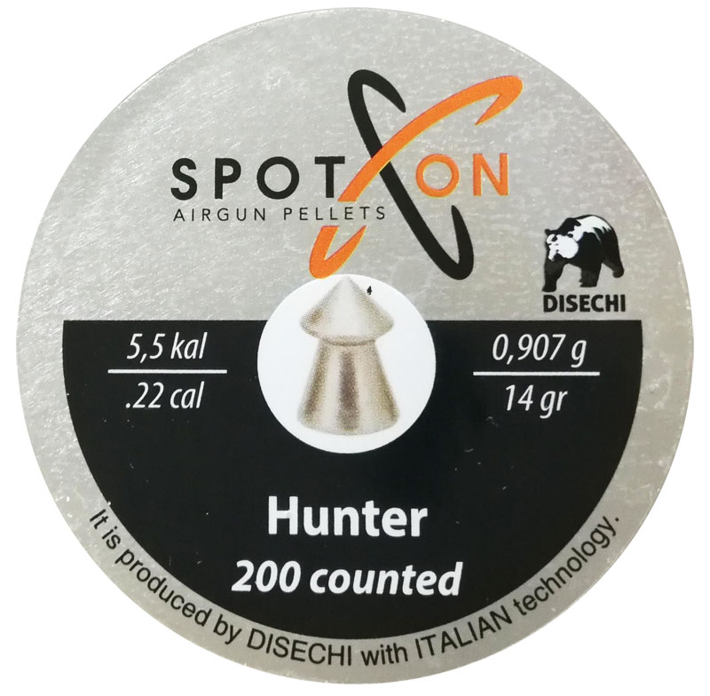 Diabolo Spoton calibro 5,5 mm .22'' modello Hunter, in piombo liscio e con testa a punta. Peso: 0,907 g. Forniti in confezione da 200 pezzi.