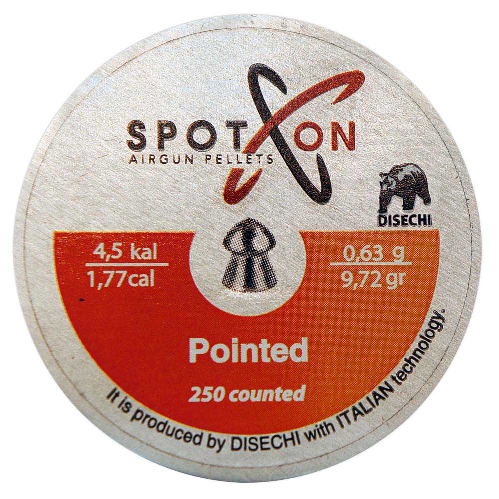 Diabolo Spoton calibro 4,5 mm .177'' modello Pointed, in piombo liscio e con testa domed leggermente appuntita. Peso: 0,63 g. Forniti in confezione da 250 pezzi.