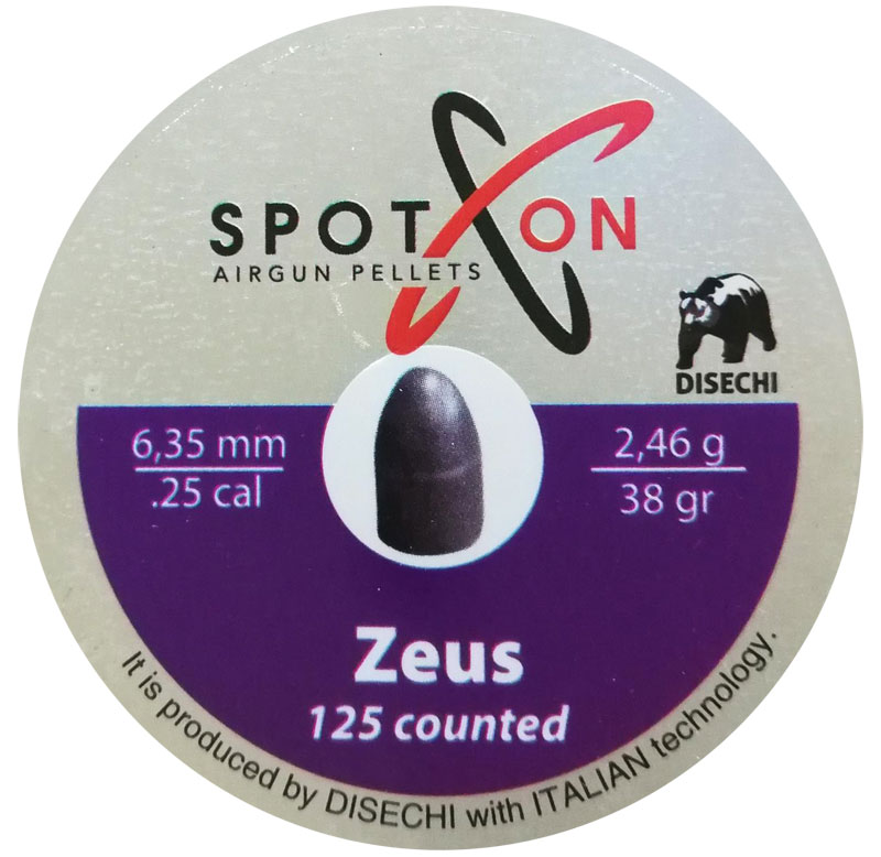 Diabolo Spoton calibro 6,35 mm .25'' modello Zeus, in piombo liscio e di forma slug. Peso: 2,46g. Forniti in confezione da 125 pezzi. Altezza piombino 9,7mm.