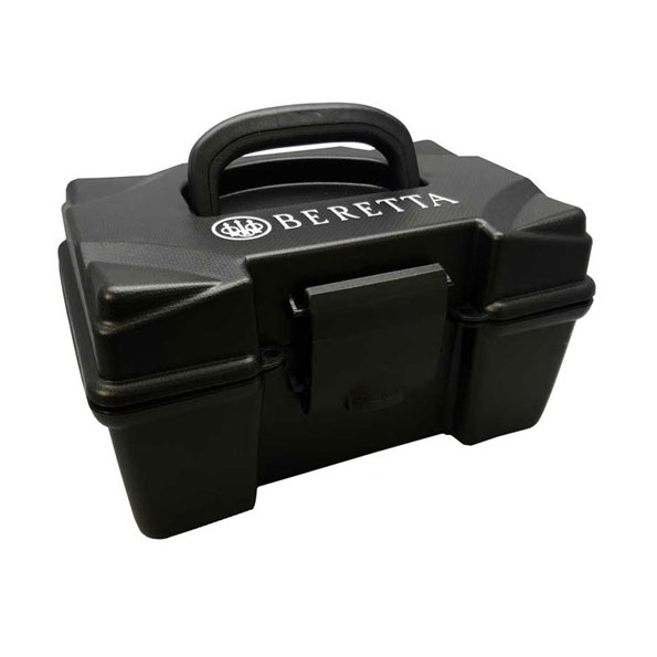 Valigetta Beretta in polietilene di colore nero. Contiene fino ad un massimo di 100 cartucce per cal. 12 oppure può essere utilizzata per trasportare accessori come cuffie, occhiali, guanti, accessori pulizia, etc. E02870